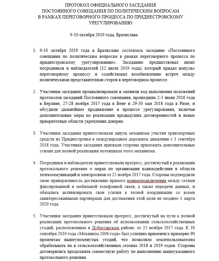 DESCHIDE.MD a intrat în posesia protocolului întocmit la Bratislava și care urma să fie semnat la Munchen. Potrivit prevederilor din protocol, la Bratislava participanții la negocieri au discutat toate subiectele din pachetul „Berlin+”, deciziile protocolare semnate de Guvernul Filip cu administrația separatistă de la Tiraspol și s-au angajat să facă eforturi suplimentare pentru a valorifica pe deplin potențialul mecanismelor deja implementate.
